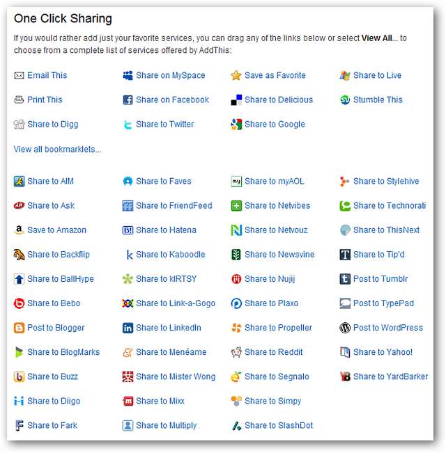 Dacă aveți nevoie de un bookmarklet care se concentrează pe un singur serviciu social în loc de mai multe servicii, puteți naviga în biblioteca bookmarklet disponibilă pe site-ul AddThis. Faceți clic pe linkul „Vizualizați toate marcajele ...” pentru a vedea ofertele disponibile.