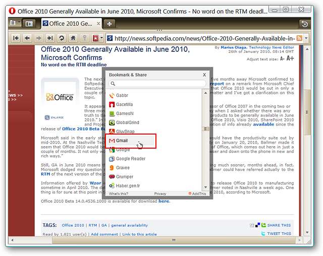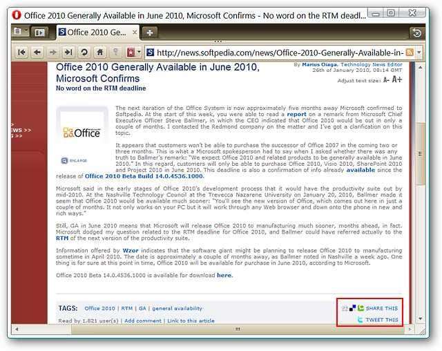 Pentru exemplul nostru, ne-am uitat la un articol referitor la data generală de disponibilitate a MS Office 2010. Dacă doriți să țineți pasul cu datele de disponibilitate pentru cele mai noi versiuni, atunci acesta este cu siguranță unul pentru „listă”. Observați „secțiunea de partajare” din colțul din dreapta jos ...