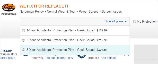 În timpul procesului de check-out, Best Buy încearcă să vă vândă un „Plan de protecție accidentală” al echipei Geek Squad. Pentru a obține un an suplimentar de garanție extinsă Best Buy, ar trebui să plătiți 324,98 USD pentru un „Plan de protecție accidentală pe 3 ani”. Practic, ați plăti mai mult de jumătate din prețul laptopului dvs. pentru un an suplimentar de garanție - nu uitați, garanțiile standard vă vor acoperi oricum în primii doi ani.