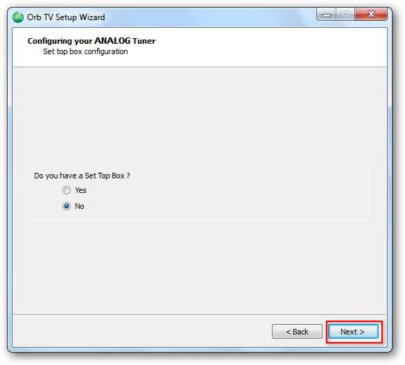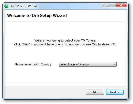 Dacă aveți un card tuner TV conectat la computer, puteți opta pentru configurarea Orb pentru a transmite în direct TV sau înregistrate. Clic Următor → pentru a configura televizorul. Sau, alegeți Ocolire dacă nu doriți să configurați Orb pentru TV.