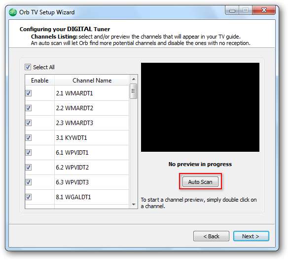 Puteți selecta sau deselecta orice canale bifând sau debifând caseta de pe fiecare canal. Selectați Auto Scan pentru a permite Orb să găsească mai multe canale sau să le dezactiveze pe cele fără recepție. Clic Următor → când este terminat.