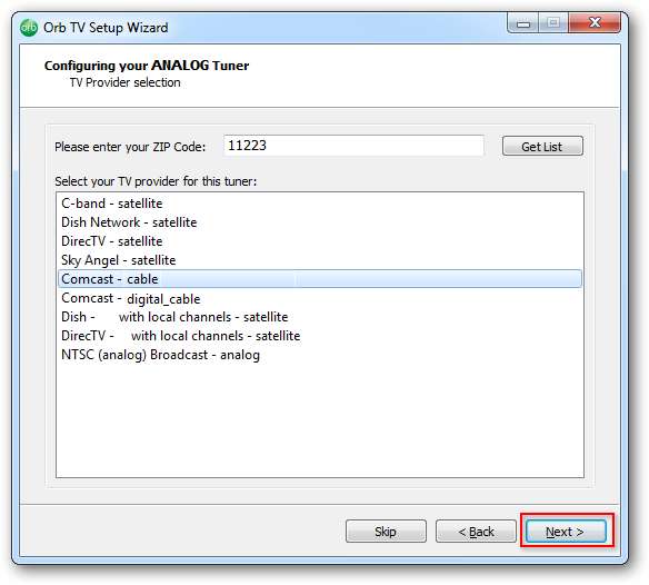 Dacă aveți un card tuner digital, tastați codul zip și faceți clic pe Obțineți lista pentru a extrage listele de canale. Selectați un furnizor TV din listă și faceți clic pe Următor → . Dacă nu, faceți clic pe Ocolire .