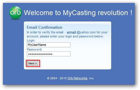 Fișierele media sunt accesate printr-o interfață web. Cu toate acestea, înainte de a merge mai departe, va trebui să ne confirmăm numele de utilizator și parola. Verificați căsuța de e-mail pentru a primi un e-mail de la Orb Networks. Faceți clic pe linkul de confirmare atașat. Vi se va solicita să introduceți numele de utilizator și parola pe care le-ați selectat în browser, apoi faceți clic pe Următor → .