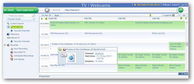 Dacă aveți un card tuner TV pe care l-ați configurat pentru Orb, veți vedea ghidul de programe pe TV / camere web ecran. Pentru a viziona sau a înregistra o emisiune, faceți clic pe lista de programe pentru a afișa o casetă de detalii. Apoi faceți clic pe butonul roșu pentru a înregistra sau pe butonul verde pentru a juca.