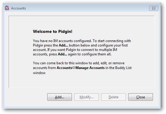 Pidgin rulează pe Windows, Linux și alte sisteme de operare Unix. Deci, indiferent de platforma pe care vă aflați, puteți utiliza Pidgin ca client de chat. Instalați Pidgin utilizând programul de instalare potrivit din site-ul lor web . Veți vedea ecranul de întâmpinare când se termină instalarea, unde puteți adăuga prima rețea de chat făcând clic pe butonul „Adăugați”.