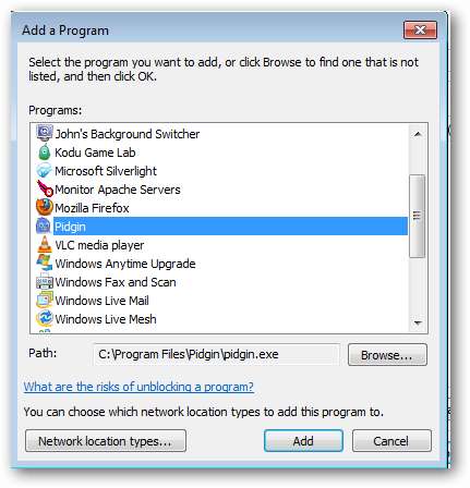 Selectați Pidgin din lista de programe și faceți clic pe butonul „Adăugați”.