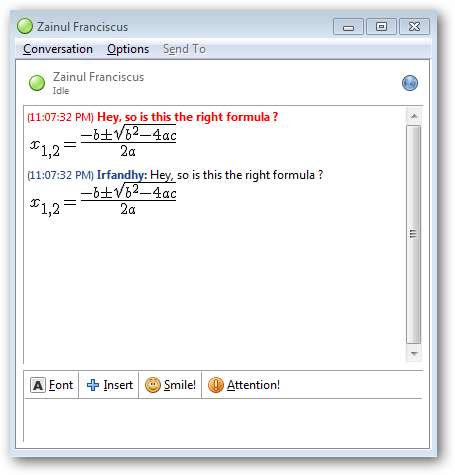 Dacă sunteți familiarizat cu LaTex, puteți utiliza Pidgin pentru a schimba formula matematică cu prietenii dvs. instalând Plugin Pidgintex . Pur și simplu scrieți „ $$ expresie latex $$ ’ oriunde într-un mesaj și o imagine a formulei matematice va apărea în jurnalul de mesaje.
