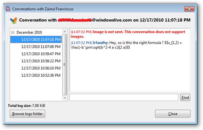 Pidgin vă va arăta toate conversațiile pe care le-ați avut cu prietenul dvs. Din păcate, Pidgin redă formula matematică doar ca o expresie LaTex în jurnal.