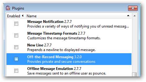 Pidgin are la dispoziție mai multe instrumente de criptare, dar folosim cel mai mult pluginul „Mesaje off-the-record (OTR)”. După ce ați instalat pluginul, trebuie să îl activați din ecranul Plugin.