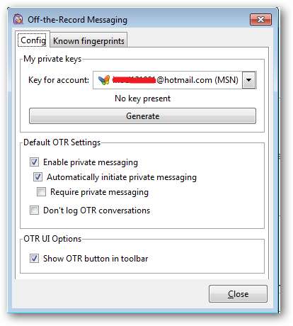 OTR utilizează o criptare cu cheie public-privată pentru a vă cripta conversația. Va trebui să generați o cheie privată făcând clic pe butonul „Generați” din ecranul OTR înainte de a putea utiliza OTR pentru a vă cripta conversațiile.