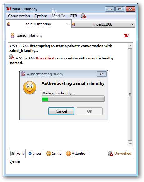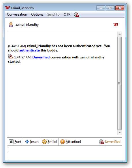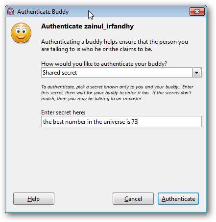 Introduceți secretul partajat în câmpul furnizat în caseta de dialog Authenticate Buddy. După ce introduceți secretul și apăsați OK, prietenul dvs. va fi rugat să facă exact același lucru. Dacă introduceți amândoi același text, atunci OTR va accepta că vorbiți cu adevărat cu prietenul dvs. În caz contrar, OTR raportează că autentificarea a eșuat. Acest lucru înseamnă că prietenul dvs. a făcut o greșeală introducând textul sau poate însemna că cineva vă interceptează comunicarea.