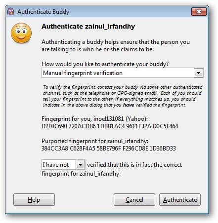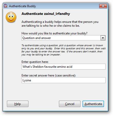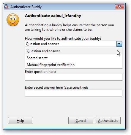 Există 3 opțiuni pentru autentificarea unui prieten: printr-o întrebare și răspuns, un secret comun sau prin verificarea amprentei OTR a unui prieten.