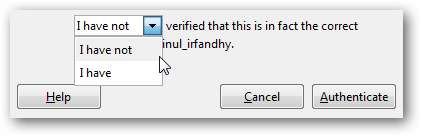 Dacă amprenta se potrivește cu amprenta pe care v-a spus-o prietenul dvs., alegeți opțiunea „Am” din lista derulantă, apoi faceți clic pe butonul „Autentificare”. După ce faceți acest lucru, starea OTR se va schimba în „Privat”. Rețineți că trebuie să faceți acest lucru doar o dată pe prieten (sau o dată pe amprentă, dacă prietenul dvs. are mai multe amprente digitale). OTR își va aminti ce amprente pe care le-ați marcat ca verificate.