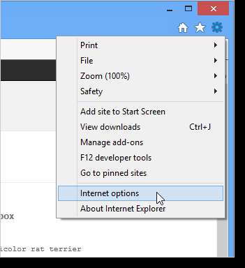 UI Windows IE10 și Internet Explorer pentru desktop partajează o pagină de pornire comună sau mai multe file de pagină de pornire, dacă este specificat. Pentru a seta una sau mai multe file de pagină de pornire pentru ambele versiuni de IE10, faceți clic pe pictograma roată din colțul din dreapta sus al ferestrei și selectați Opțiuni Internet din meniul derulant.
