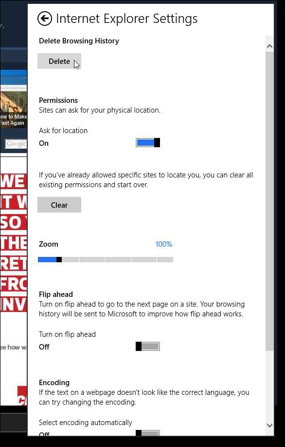 Un set prescurtat de opțiuni pentru versiunea IE10 pentru Windows UI este disponibil mutând mouse-ul în colțul extrem, inferior, dreapta al ecranului în timp ce se află în IE10. Se afișează bara Charms. Faceți clic pe farmecul Setări. Se afișează panoul Setări Internet Explorer.