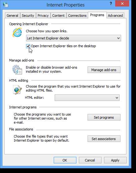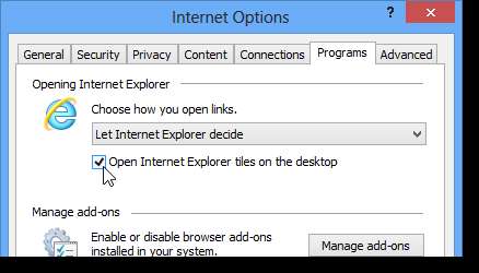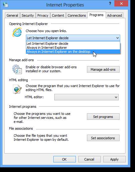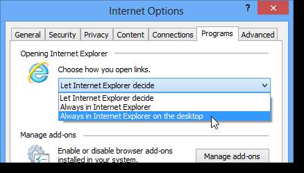 Cu toate acestea, aceste comportamente pot fi schimbate. Pentru aceasta, deschideți caseta de dialog Opțiuni Internet așa cum este descris mai sus și faceți clic pe fila Programe. Selectați o opțiune din linkurile Alegeți cum deschideți. Dacă doriți să utilizați întotdeauna IE10 pe desktop, selectați Întotdeauna în Internet Explorer pe desktop.