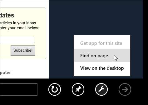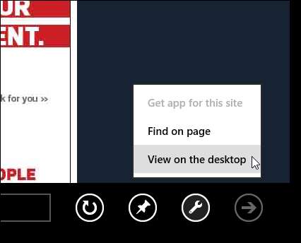 Versiunea modernă UI / Metro a IE10 nu acceptă ActiveX sau alte extensii / suplimente (mai multe despre asta mai târziu). Acest lucru ar putea face ca unele pagini web să nu se afișeze corect. Dacă întâlniți acest lucru, puteți deschide o anumită pagină web deschisă în versiunea modernă UI / Metro a IE10 în versiunea desktop a IE10. Pentru a face acest lucru, faceți clic pe pictograma Instrumente de pagină din bara de navigare din partea de jos a ecranului în versiunea modernă UI / Metro a IE10 și selectați Vizualizare pe desktop.
