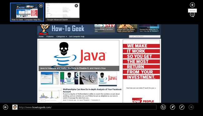 Versiunea modernă UI / Metro a IE10 oferă două bare de aplicații. Bara de jos se numește bara de navigare și include butonul Înapoi, pictograma site-ului, bara de adrese, butonul Reîmprospătare / Stop, butonul Pin to Start / Jump List, butonul Instrumente de pagină și butonul Forward. Bara superioară se numește Tab Switcher și afișează miniaturile filelor deschise și a butoanelor Filă nouă și Meniu filă. Bara de comutare a filelor vă permite, desigur, să comutați filele, să deschideți o filă nouă, să închideți filele existente și să deschideți o filă nouă InPrivate.