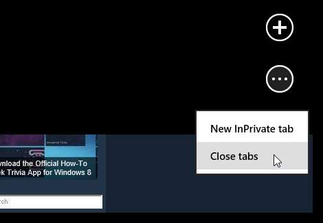 Faceți clic pe butonul ... pentru a afișa un meniu pop-up care vă permite să deschideți o nouă filă InPrivate (discutată mai târziu în acest articol) sau să închideți toate filele, cu excepția filei afișate în prezent. Dacă este deschisă o singură filă, opțiunea Închidere filele este gri.
