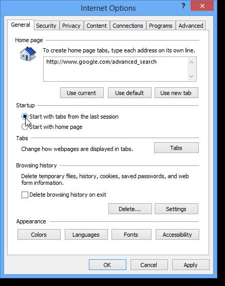 La fel ca versiunea desktop a IE10, fiecare filă din versiunea modernă UI / Metro a IE10 are propriul istoric de navigare. Dacă o filă se blochează, toate celelalte file și IE10 în sine continuă să funcționeze normal. Puteți avea versiunea modernă UI / Metro a IE10 să deschidă filele din ultima sesiune data viitoare când deschideți browserul, dar trebuie să setați acea opțiune în versiunea desktop a IE10. Accesați caseta de dialog Opțiuni Internet, așa cum s-a menționat anterior în acest articol, și selectați butonul radio Începere cu file din ultima sesiune din secțiunea Startup din fila General.