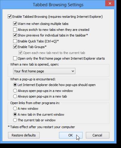Pentru a seta opțiuni pentru navigarea cu file în ambele versiuni de IE10, faceți clic pe butonul Tabs din secțiunea Tabs din fila General din caseta de dialog Opțiuni Internet.