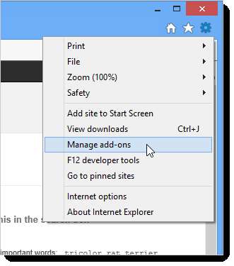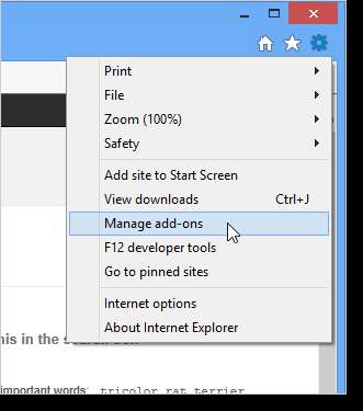 Versiunea modernă UI / Metro a IE10 nu acceptă programe de completare. Pentru a profita de funcționalitatea suplimentară a suplimentelor, utilizați versiunea desktop IE10. Pentru a vă gestiona programele de completare în versiunea desktop IE10, faceți clic pe butonul roată din colțul din dreapta sus al ferestrei IE10 și selectați Gestionare programe de completare din meniul derulant.