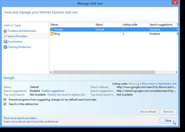 Faceți clic pe Căutare furnizori în lista Tipuri de programe de completare din partea stângă a casetei de dialog Gestionare programe de completare. Pentru a schimba furnizorul de căutare implicit, selectați furnizorul dorit din listă și faceți clic pe Setare ca implicit. De asemenea, puteți activa sugestii de căutare pentru orice furnizor de căutare selectând furnizorul și făcând clic pe linkul Activare sugestii. Mutați furnizorii de căutare în sus și în jos în listă sau sortați-i în ordine alfabetică, utilizând linkurile Ordinea listării. Utilizați butonul Eliminare pentru a elimina orice furnizor de căutare selectat.