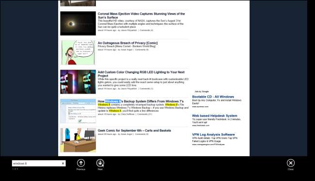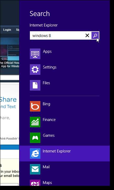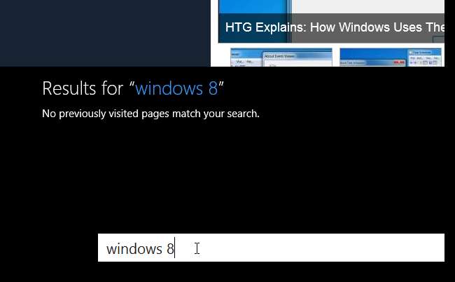 De asemenea, puteți căuta în versiunea modernă UI / Metro a IE10 utilizând bara de căutare. Pentru a activa bara de căutare, apăsați tasta Windows + Q. Este aceeași metodă de căutare a aplicațiilor și a setărilor în Windows 8.