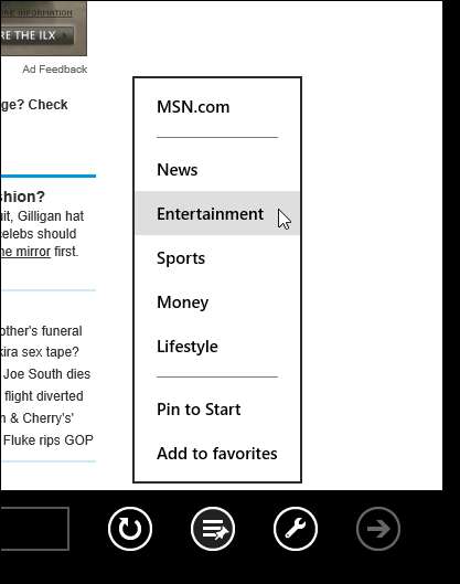Când deschideți un site pe care l-ați fixat pe ecranul de pornire Modern UI / Metro, prin versiunea Modern UI / Metro a IE10, este posibil să aveți acces la opțiunile dintr-o listă de salt, dacă site-ul web utilizează liste de salt. Butonul Pin to Start din bara de navigare este înlocuit cu un nou buton din meniul listei de salt. Faceți clic pe butonul respectiv pentru a vedea orice listă de salturi oferită de site-ul fixat.