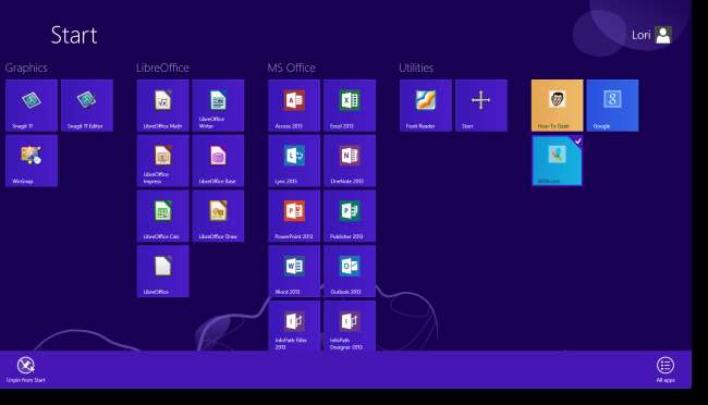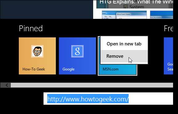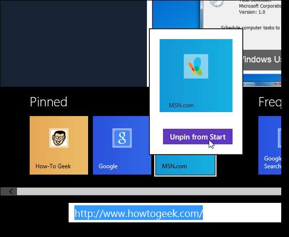 Există câteva moduri de a anula fixarea unui site. O modalitate este să faceți clic dreapta pe țiglă pe ecranul Modern UI / Metro Start și apoi să faceți clic pe butonul Anulare de la Start din bara de jos.