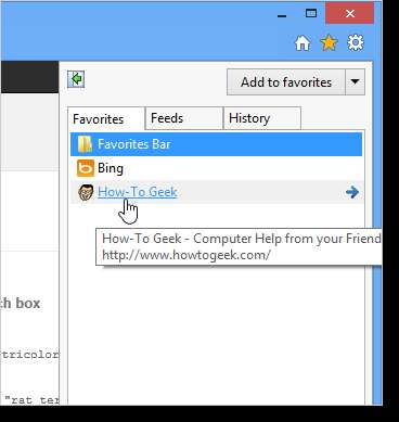 Favorite în versiunea desktop IE10 sunt afișate în centrul Favorite, accesate făcând clic pe pictograma stea din colțul din dreapta sus al ferestrei IE10 sau apăsând Alt + C. Fila Favorite se afișează în mod implicit atunci când utilizați Alt + C pentru a accesa centrul de Favorite, Feeduri și Istoric.