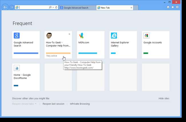 Site-urile frecvente din versiunea desktop IE10 sunt afișate pe pagina Filă nouă.