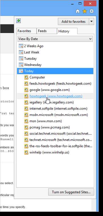 Istoricul dvs. de navigare nu este afișat în versiunea modernă UI / Metro a IE10, dar este utilizat pentru a urmări site-urile dvs. frecvente. Istoricul dvs. de navigare în versiunea desktop IE10 este disponibil în centrul Istoric, accesat și făcând clic pe pictograma stea din colțul din dreapta sus al ferestrei IE10 sau apăsând Alt + C și apoi făcând clic pe fila Istoric.