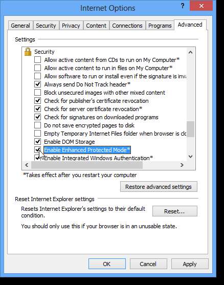 Cookie-urile de sesiune sunt partajate între cele două versiuni ale IE10. Cookie-urile persistente sunt partajate între cele două versiuni numai atunci când setarea Mod protejat îmbunătățit (EPM) este aceeași pentru ambele versiuni. În mod implicit, versiunea modernă UI / Metro a IE10 a activat EPM, iar versiunea desktop a IE10 a dezactivat EPM. Dacă doriți ca cookie-urile persistente, cum ar fi informațiile de conectare a site-ului, să fie disponibile în ambele versiuni ale IE10, activați setarea EPM așa cum s-a discutat în secțiunea anterioară.