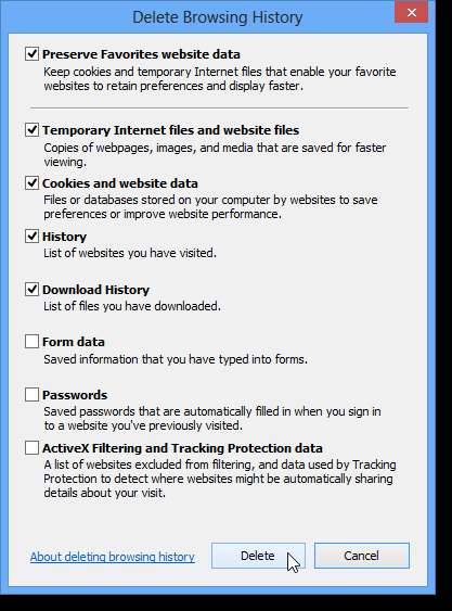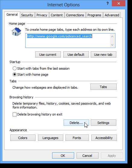 Cookie-urile pot fi șterse deschizând caseta de dialog Opțiuni Internet, așa cum am menționat anterior în acest articol. Faceți clic pe butonul Ștergere din secțiunea Istoric navigare din fila General.