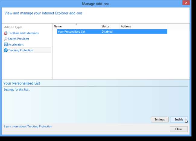 Pentru a activa sau dezactiva un TPL, faceți clic pe Protecție de urmărire sub Tipuri de suplimente, apoi faceți clic pe numele listei dorite din dreapta. Faceți clic pe Activați sau Dezactivați după cum este necesar.
