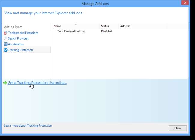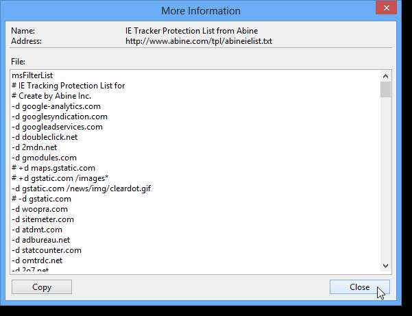 Lista este adăugată la lista de protecție de urmărire din caseta de dialog Gestionare programe de completare. Pentru a vizualiza conținutul listei, selectați numele listei și faceți clic pe linkul Mai multe informații din jumătatea inferioară a casetei de dialog.