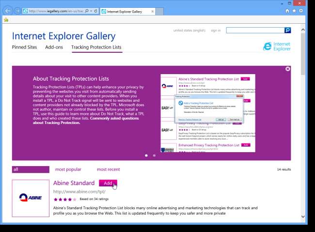 Galeria Internet Explorer se deschide în IE10, afișând o listă de site-uri web care oferă TPL-uri premade. Faceți clic pe butonul Adăugare de lângă un nume de site / listă pentru a adăuga lista la IE10.