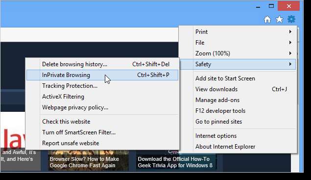 Navigarea InPrivate este disponibilă în ambele versiuni ale IE10. În versiunea desktop IE10, faceți clic pe butonul roată din colțul din dreapta sus al ferestrei IE și selectați Siguranță | În Navigare privată din meniul derulant (sau apăsați Ctrl + Shift + P).