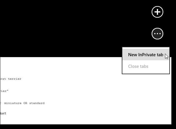 În versiunea modernă UI / Metro a IE10, puteți deschide o filă InPrivate nouă selectând opțiunea din butonul ... de pe bara de comutare tab (discutat mai devreme în acest articol). Accesați bara Tab Switcher apăsând tasta Windows + Z sau făcând clic dreapta pe pagina web curentă (nu pe un link).