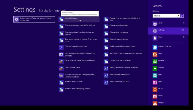 Dacă ați decis că nu vă place versiunea modernă UI / Metro a IE10, o puteți dezactiva. Pentru aceasta, apăsați tasta Windows + W pentru a deschide căutarea Setări și tastați „internet” (fără ghilimele). Faceți clic pe Opțiuni Internet în lista de rezultate din stânga.