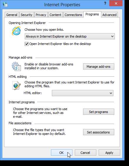 Faceți clic pe OK pentru a accepta modificările și a închide caseta de dialog. Toate linkurile în afara IE10 și site-urile fixate de pe bara de activități și de pe ecranul modern UI / Metro Start se vor deschide acum în versiunea desktop a IE10.