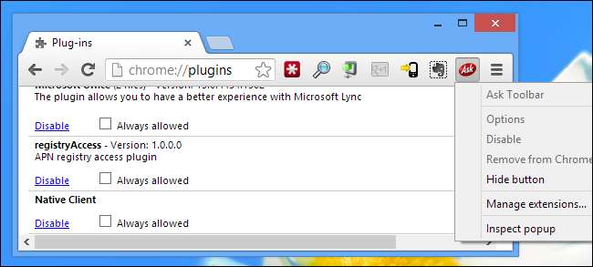 Pentru a înrăutăți lucrurile, îndreptându-vă spre about: plugins arată ceva cu adevărat înfricoșător - Bara de instrumente Ask instalează un .... plugin de acces la registru? De ce un plugin de browser se învârte în registrul dvs.? De ce nu puteți dezinstala extensia?