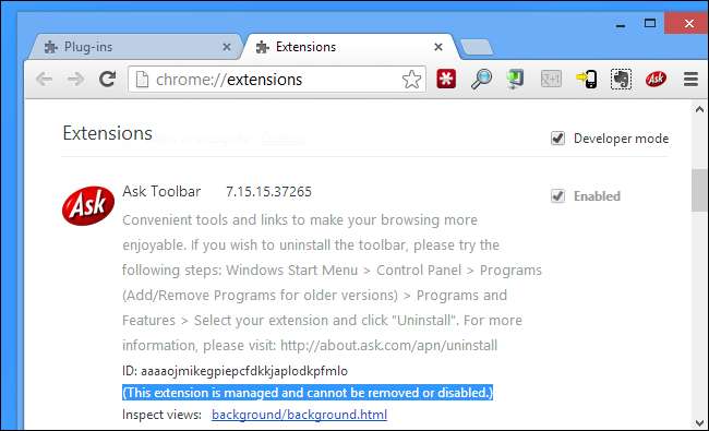De ce naiba Google permite extensii care nu pot fi eliminate? Adică, chiar și Internet Explorer vă permite să faceți clic pe un singur buton pentru a elimina definitiv Bara de instrumente Ask. De fapt, dacă deschideți IE, nici măcar nu veți vedea teribila bară de instrumente Ask, cu excepția cazului în care alegeți în mod intenționat și, odată ce faceți, din nou, un singur buton de eliminat.