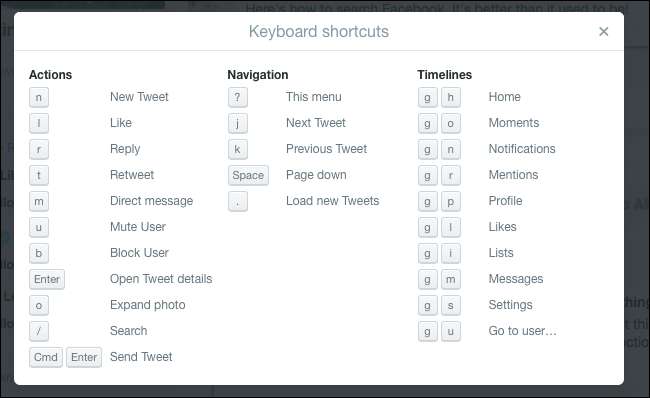 Nu mulți oameni își dau seama de acest lucru, dar aplicațiile web pot avea și comenzi rapide de la tastatură , inclusiv Facebook și Twitter. Învățarea comenzilor rapide de la tastatură Twitter nu este dificilă: există o modalitate rapidă de a le învăța. Doar apăsați „?” și veți vedea acest pop-up: