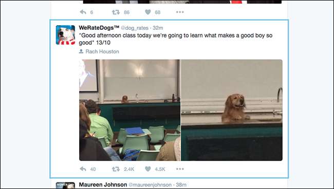 Dacă, în timp ce navigați, observați că există noi tweets pe care doriți să le vedeți, pur și simplu apăsați tasta „.” Sau punct. Se vor deschide tweet-uri noi în partea de sus a cronologiei, iar Twitter va derula în partea de sus și va selecta primul tweet pentru dvs.