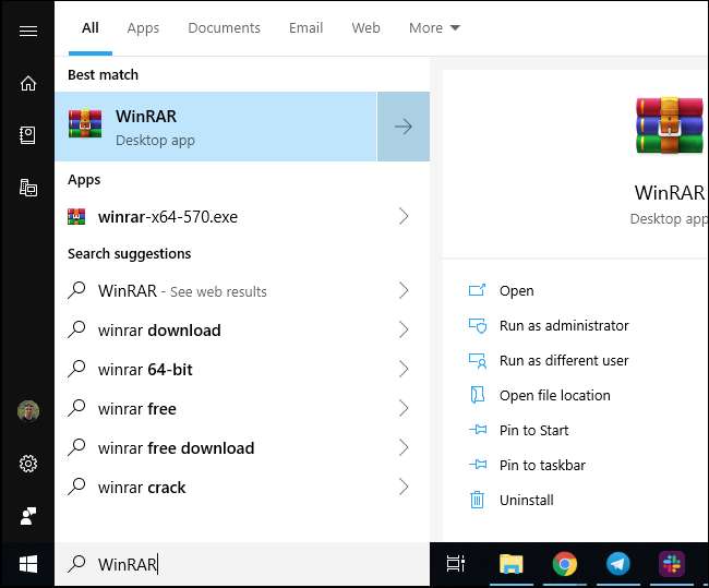 Dacă nu sunteți sigur dacă aveți instalat WinRAR, trebuie doar să efectuați o căutare în meniul Start pentru „WinRAR”. Dacă vedeți o comandă rapidă WinRAR, aceasta este instalată. Dacă nu vedeți o comandă rapidă WinRAR, nu este.