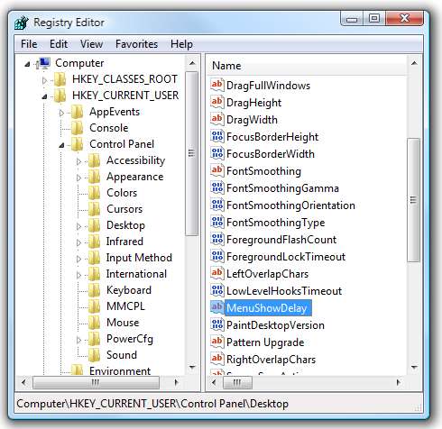 Aceasta deschide mai multe valori în panoul din stânga. Vrem să Dubla Click pe „MenuShowDelay”.
