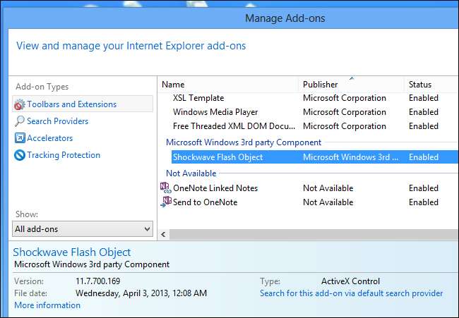 Veți avea probabil o varietate de comenzi ActiveX comune instalate la nivel de sistem, cum ar fi Adobe Shockwave Flash, Microsoft Silverlight și Windows Media Player. Puteți să le dezactivați de aici, dar va trebui să le dezinstalați din Panoul de control dacă doriți să le eliminați din sistemul dvs.