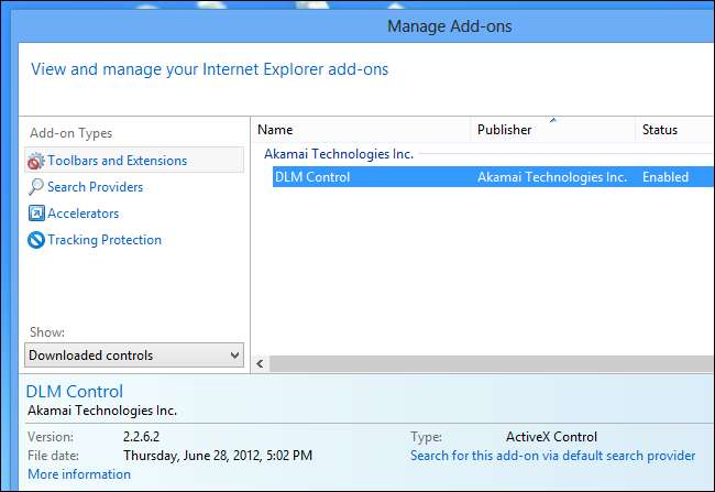 Puteți vizualiza comenzile ActiveX pe care le-ați instalat făcând clic pe meniul roată din Internet Explorer și selectând Gestionare programe de completare. Faceți clic pe caseta de sub Afișare și selectați Toate suplimentele.
